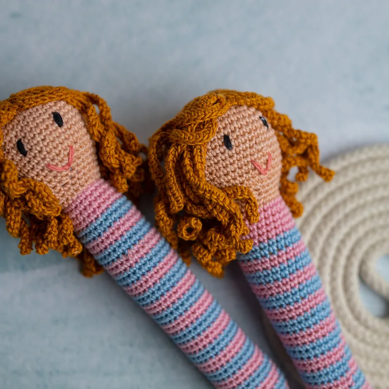 Unlike traditional plastic skipping ropes, our handmade doll handle skipping rope features beautifully crafted crochet dolls as handles. These soft, comfortable grips are perfectly sized for little hands, making it easier for children to hold and enjoy extended play sessions while developing coordination and fitness skills.