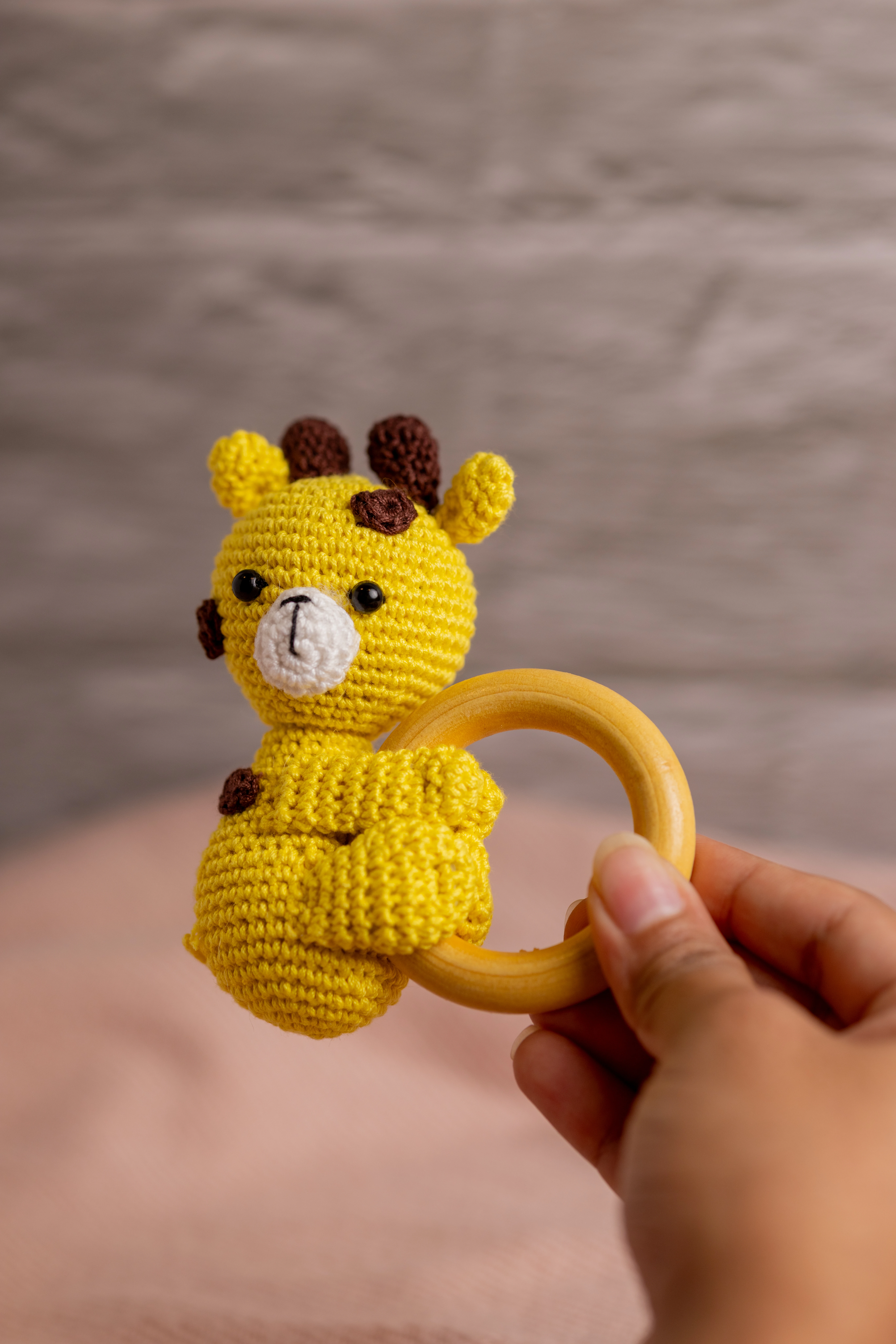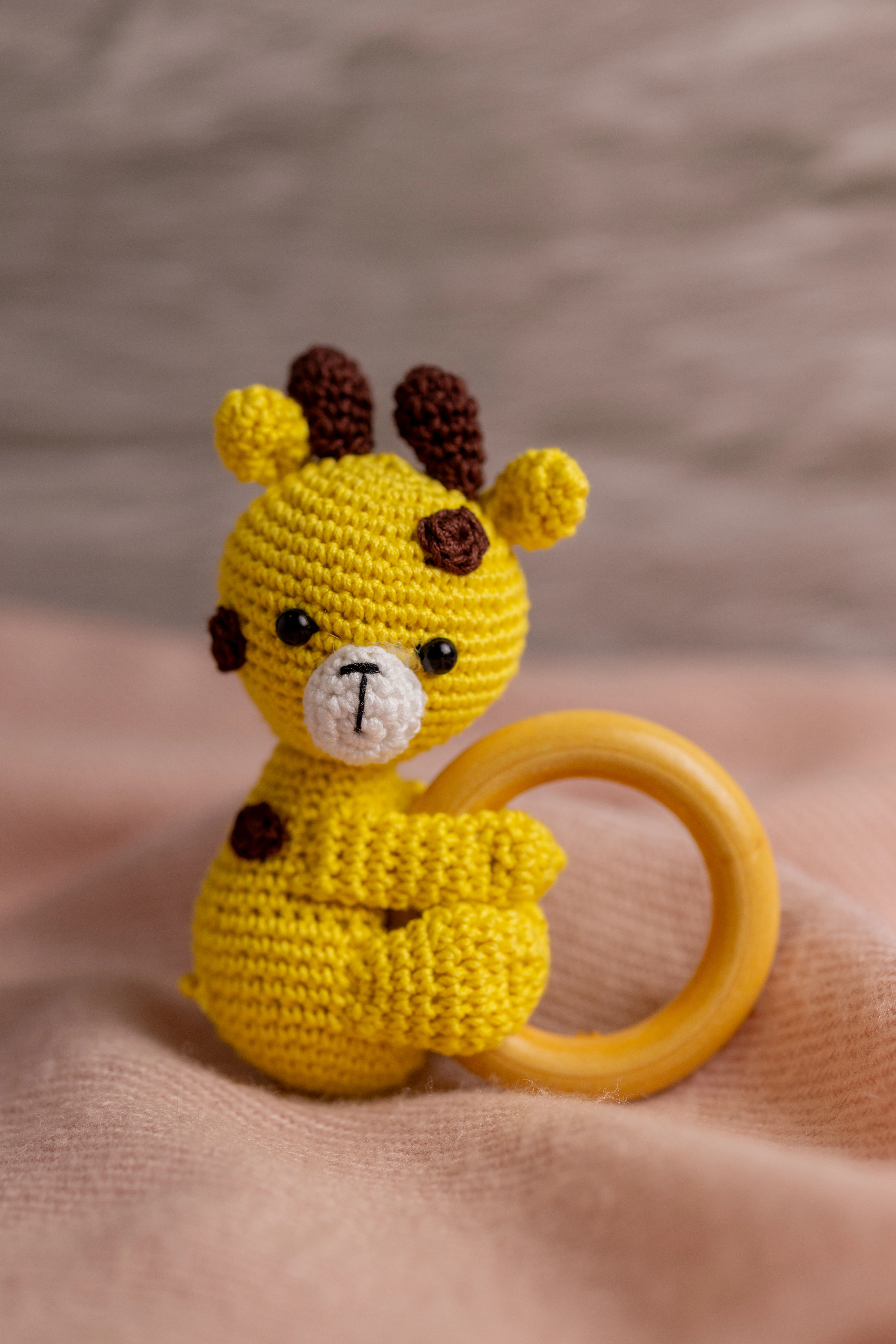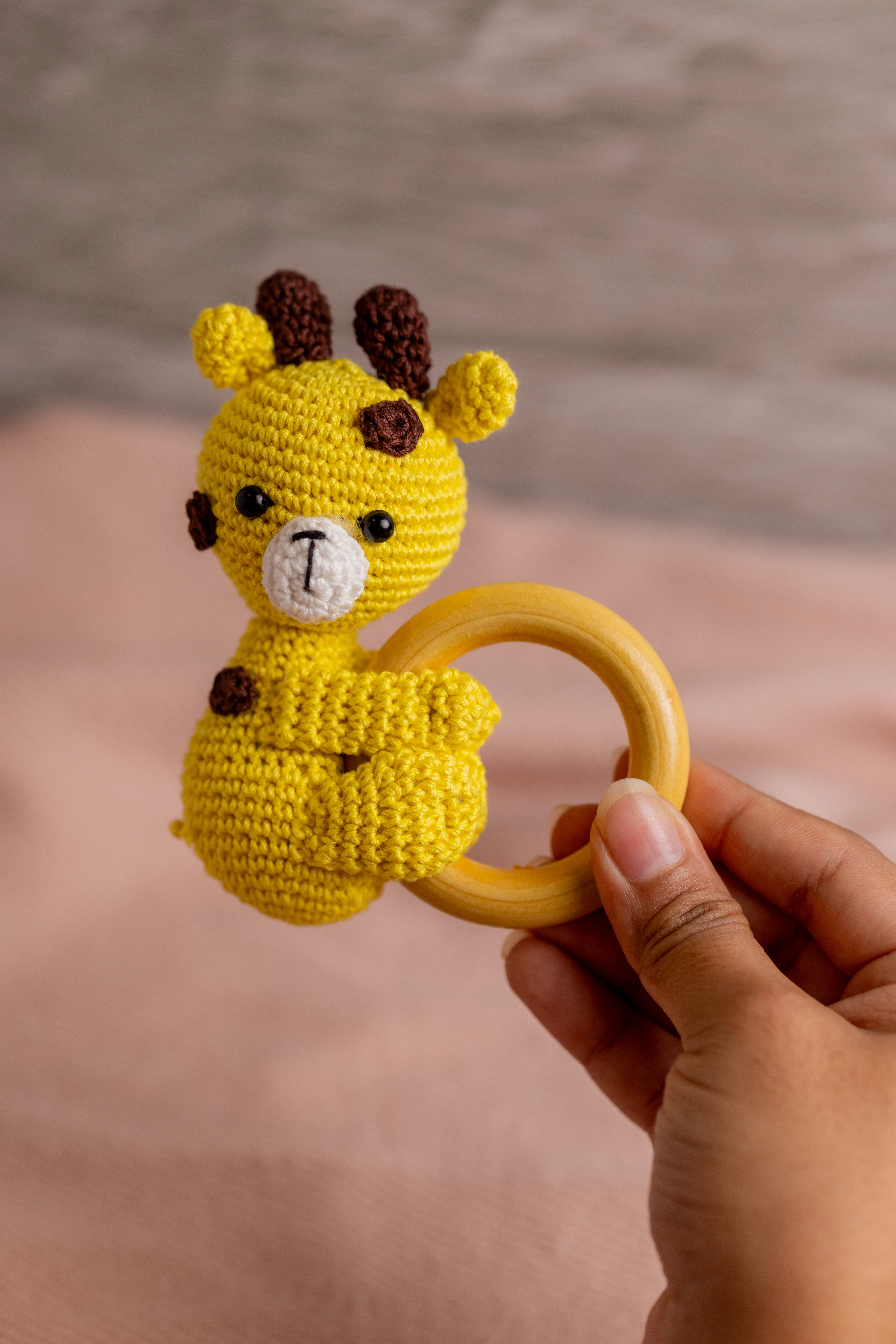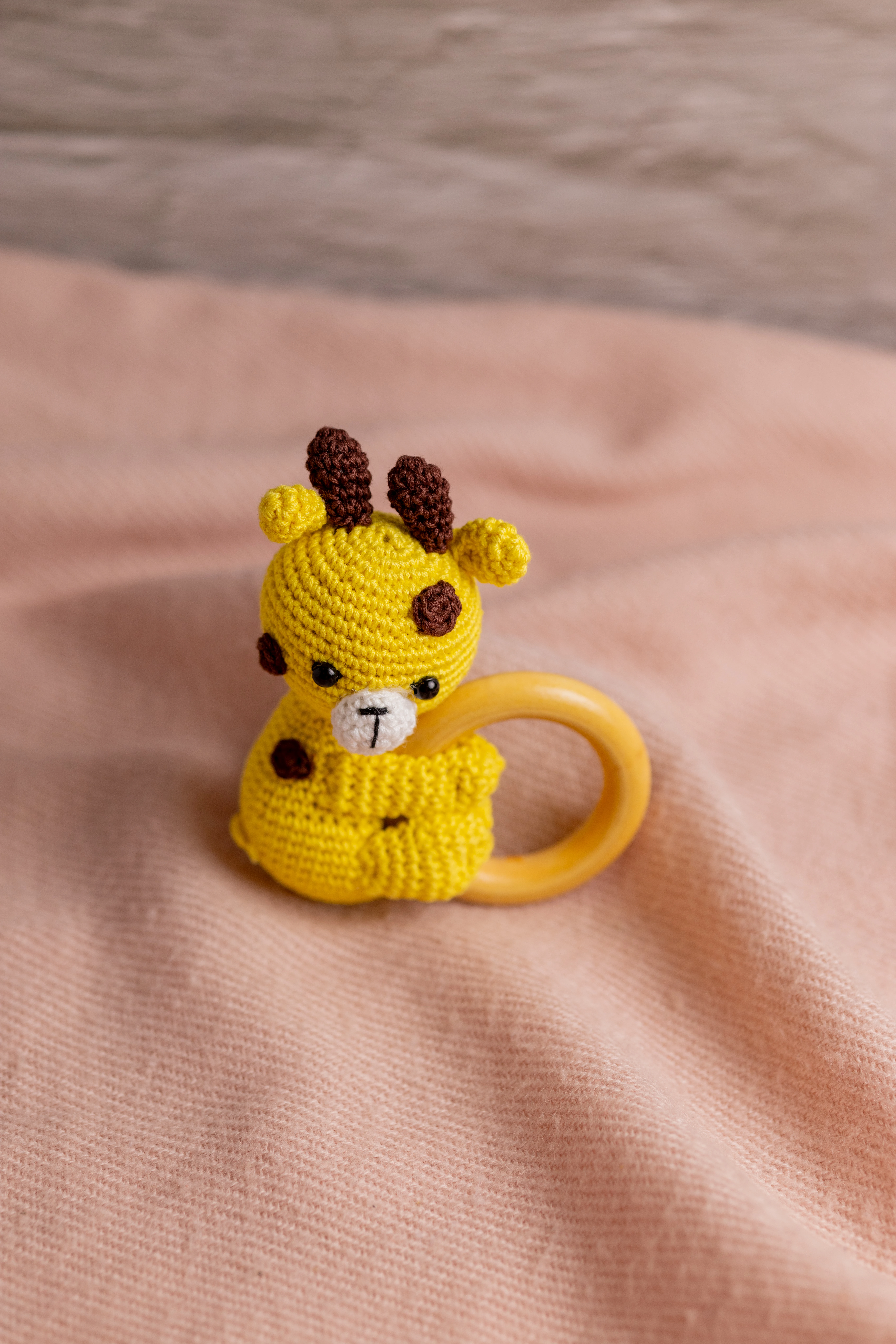 Handmade Giraffe Rattle and Toy Set. Crochet giraffe soft toy and matching sensory rattle, ideal ethical baby gift, shipped from Australia.