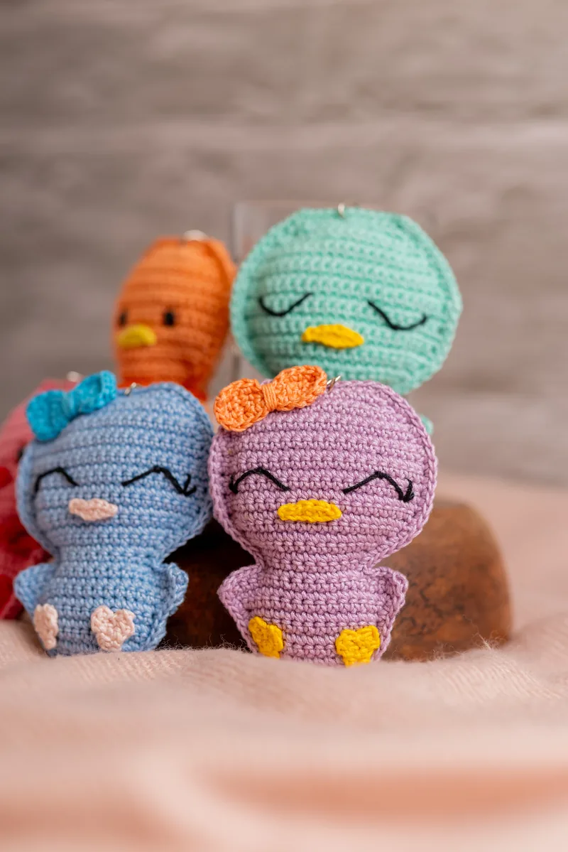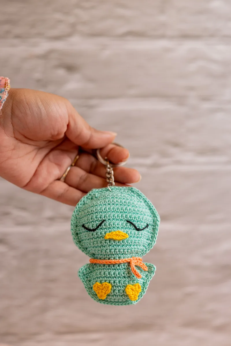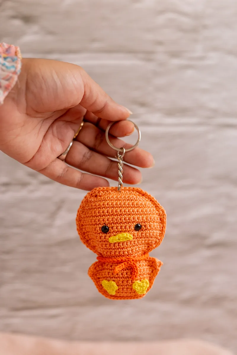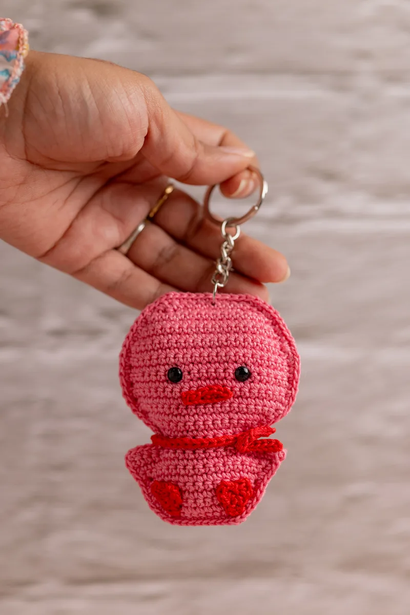 At $8 this is one of the most affordable handmade crochet keychains in the range and still genuinely well made. Each duck is crocheted by hand — you can see the individual stitches, the small beak, the rounded body. They come out slightly different from each other because they are not made by a machine, which is part of what makes them feel worth having rather than just another plastic keyring fob.