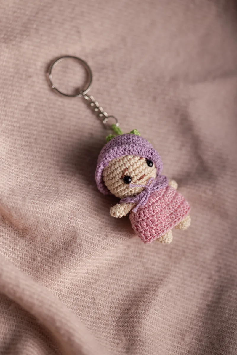 The doll keychain is also a popular choice for anyone who collects cute crochet bag charms or amigurumi accessories — the pink and purple combo is one of the more distinctive colourways in the range. If you collect a few from the keyring category they sit well together without clashing.
