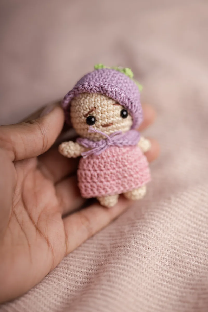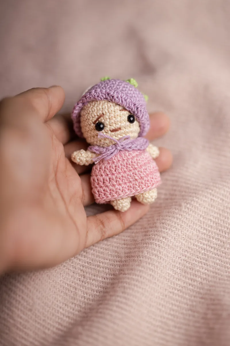 This little one tends to get noticed. The Mini Pink Purple Doll is a handmade crochet amigurumi doll keychain — about the size of your thumb, with pink crocheted hair and a purple dress, attached to a keyring so she goes everywhere with you. On your keys, clipped to your bag, hanging off a backpack zip — wherever you put her, she gets comments.